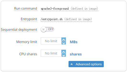 3、在高级设置中,你还可以设置Run command 、Entrypoint、Sequential deployment 、Memory limit、CPU share等等。