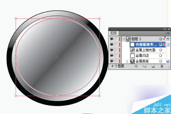 三 绘制"金属上抛光面" 1.(将二-3中复制的路径)Ctrl+F粘贴到前面,得到新路径,在图层中命名为"金属上抛光面" 2.按>键,切换到渐变填色并调出渐变调板,按住Ctrl键鼠标点击工具栏中的"渐变方框图标",将渐变重置为默认的黑白渐变!如图示006: