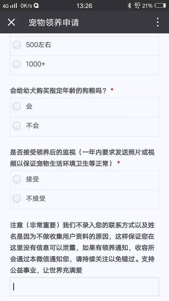 该表格内容简单,无实质性内容,特别强调了不收集联系方式,有领养通知会通过本公众号回复,再一次打消了用户顾虑并增强了用户黏性。
