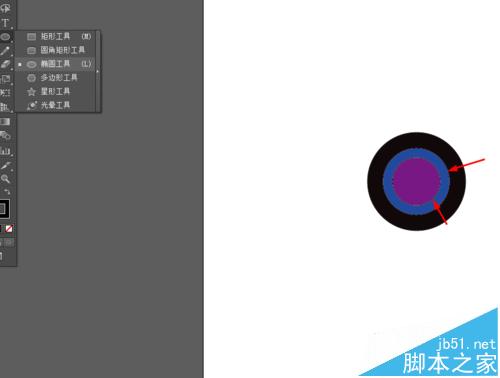 2、然后再用椭圆工具,在大圆中间画两个小圆,分别填充蓝色和紫色,如图所示
