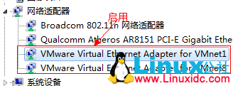 第一步,先配置vmware中的网络连接方式。先要启用vmware的虚拟机网卡,右键我的电脑——设备管理——然后网络适配器:把两张vmware的网卡设置为启用