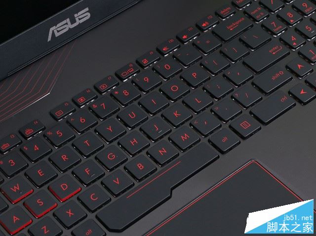 键盘带有红色背光,并对“WASD”进行了红色处理,表明游戏本身份。键盘按压时能够明显感觉到其回弹力度,手感还是非常不错的。触控板为一体式,四周有红色线条修饰,与键盘风格比较统一。