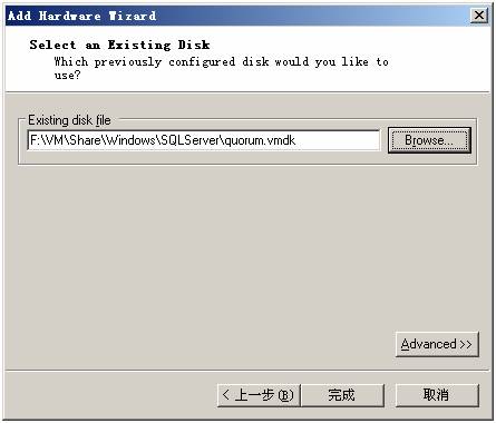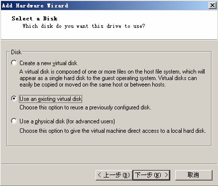 2. 添加新磁盘到虚拟机中,选择已存在的磁盘