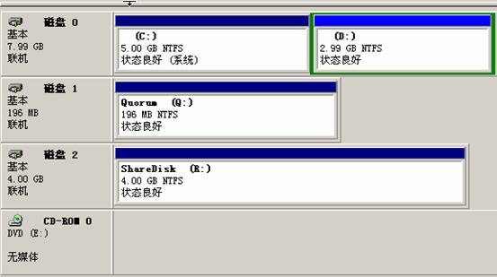 25 .配置完成后,可以在资源中看到相关磁盘,其中仲裁盘为Q 盘,数据盘为R 盘,组为组0
