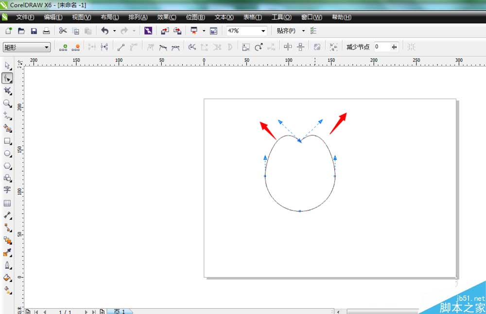 7、使用同样的操作步骤,把正圆底下的节点也变成尖突节点,并且把两边的方向线往上提