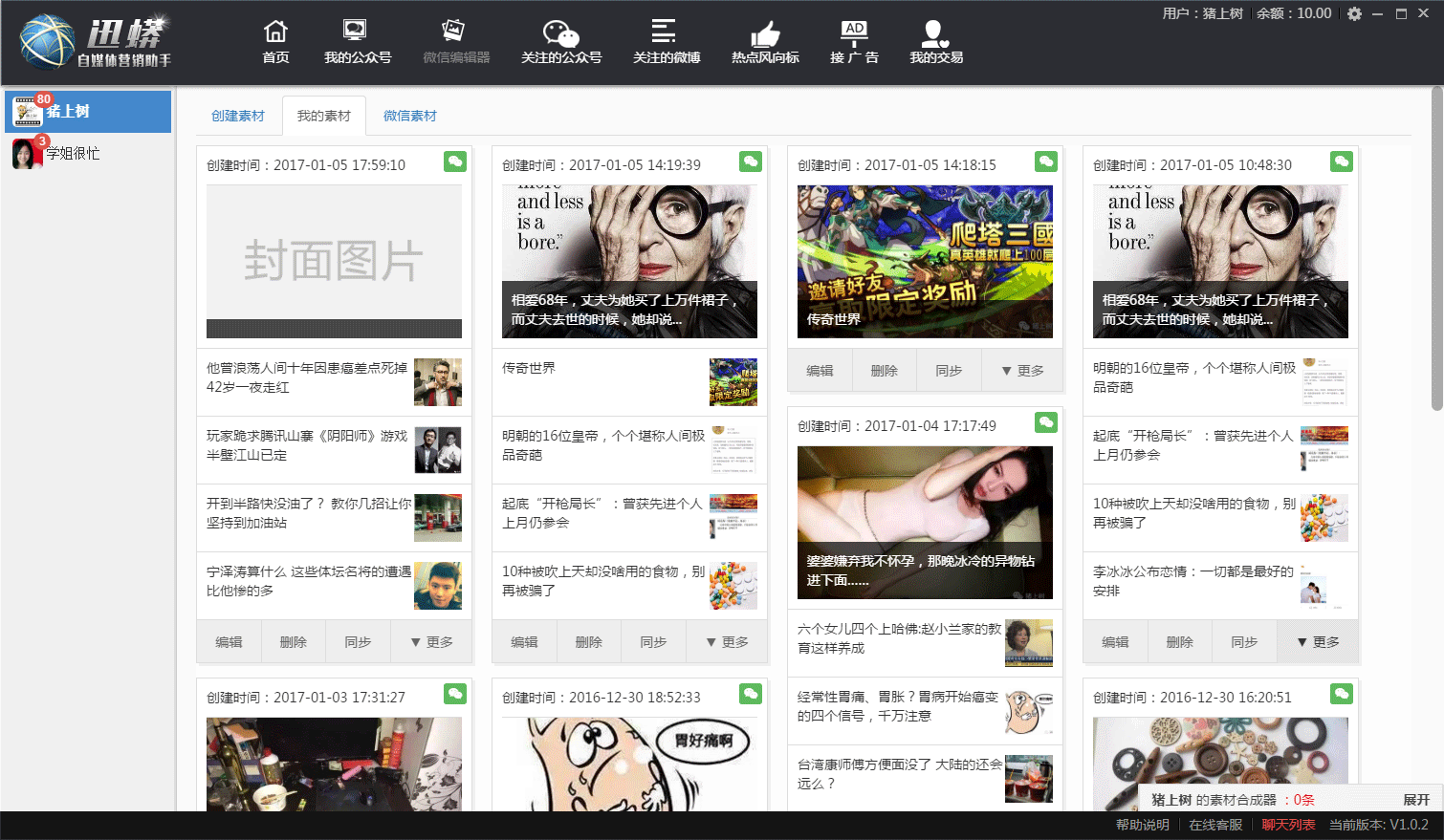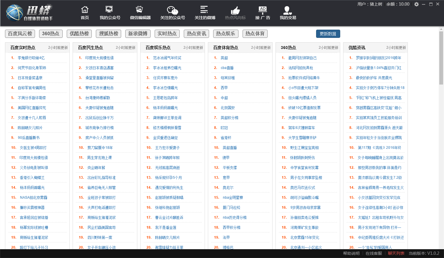 留住了粉丝才能有更多的赚钱的可能,可以推荐一款简单好用的自媒体助手——迅蟒自媒体助手。可以帮助各位公众号主,做好日常公众号的运营。丰富的素材和方便的编辑器,可以帮助你更好地编辑文章,微信微博关注,实时热点关注,可以给你每天的文章写作提供素材。还可以同时登陆多个公众号,同时管理多个公众号,可以给多个公众号同步素材。更重要的是公众号主还可以通过软件进行广告交易,管理赚钱两不耽误。