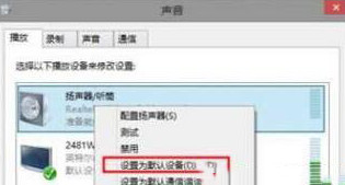 3、在声音设备中右击“扬声器/听筒”,选择“设置为默认设备”,点击确定即可
