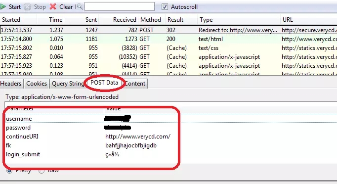 这个我就举个例子好了,以verycd为例,先找到自己发的POST请求,以及POST表单项: