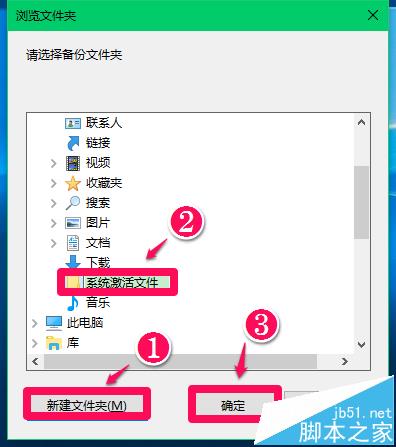 4、在浏览文件夹窗口,❶点击【新建文件夹】,❷把新建的文件夹命名为:系统激活文件(或其他名称),❸点击:确定;