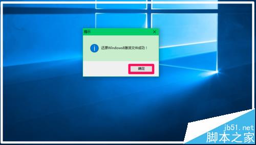 8、我们点击确定以后,即弹出一个提示对话框:还原Windows8(实际为Windows10)激活文件成功!点击:确定。