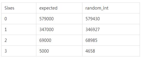 一个简单的测试是骰子游戏。假设掷1个骰子1次得到结果为6的概率是1/6,那么如果我同时掷3个骰子100次,得到的结果粗略如下:
