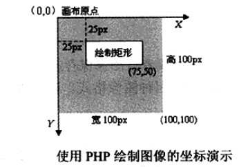 在PHP中绘制图像的函数非常丰富,包括点、线、各种几何图形等可以想象出来的平面图形,都可以通过PHP中提供的各种画图函数完成。我们在这里介绍一些常用的图像绘制,如果使用我们没有介绍过的函数,可以参考手册实现。另外,这些图形绘制函数都需要使用画布资源,并在画布中的位置通过坐标(原点是在画布左上角的起始位置,以像素为单位,沿着X轴正方向向右延伸,Y轴正方向向下延伸)决定,并且还可以通过函数的最后一个参数,设置每个图形的颜色。画布中的坐标系统如图所示。