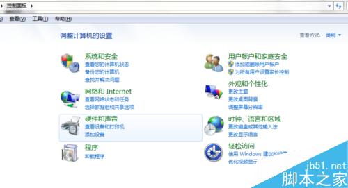 点击“硬件和声音”选项,打开硬件和声音的设置面板。