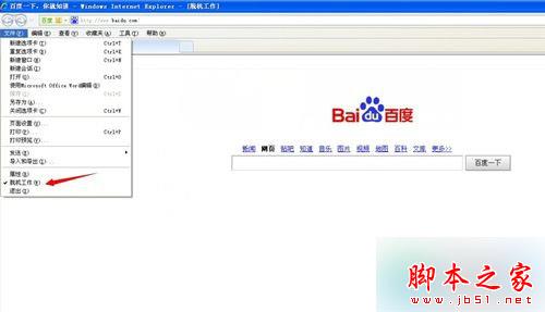3、把鼠标移动浏览器的上方导航中,找到“文件”选项并打开,在新出来的下拉列表中找到“脱机工作”这个选项,接着把它前面的勾去掉即可。