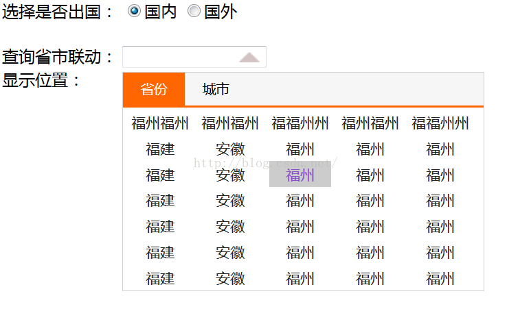 <head> <title>省市二级联动可扩展性</title> <script type="text/javascript" src="Scripts/jquery-1.9.1.min.js"></script> </head> <body> <label>选择是否出国:</label> <input type="radio" name="radio1" value="1" />国内 <input type="radio" name="radio1" value="2" />国外<br /><br /> <label>查询省市联动:</label> <input type="text" id="txt_proCity" onkeyup="GetOutCounty()" readonly="readonly" runat="server" /> <input type="button" id="btnImg" class="btn_img1" name="img1" onclick="changeImg()" /><br /> <label>显示位置:</label><br /> <div id="divProCity"> <ul class="headMenu"> <li class="liDefault">省份</li> <li>城市</li> [html] view plain copy <li>国外</li> </ul> <div class="liDiv1"> <ul> <li>福州福州</li> <li>福州福州</li> <li>福福州州</li> <li>福州福州</li> <li>福福州州</li> <li>福建</li> <li>安徽</li> <li>福州</li> <li>福州</li> <li>福州</li> <li>福建</li> <li>安徽</li> <li>福州</li> <li>福州</li> <li>福州</li> <li>福建</li> <li>安徽</li> <li>福州</li> <li>福州</li> <li>福州</li> <li>福建</li> <li>安徽</li> <li>福州</li> <li>福州</li> <li>福州</li> <li>福建</li> <li>安徽</li> <li>福州</li> <li>福州</li> <li>福州</li> <li>福建</li> <li>安徽</li> <li>福州</li> <li>福州</li> <li>福州</li> </ul> </div> <div class="liDiv2"> <p style="text-align:center;color:#F60"><strong>请先选择省份!</strong></p> </div>