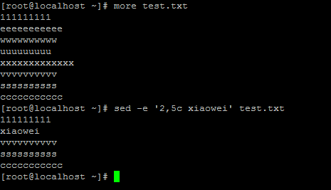 > sed -e '2,5c xiaowei' test.txt #把2-5行替换成字符串xiaowei