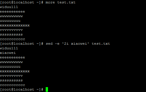# i 插入 自定义的字符串 在test.txt的第二行插入xiaowei
