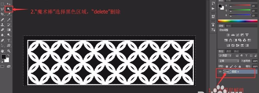 2、双击“图层”解锁,“魔术棒”勾选中黑色趋于,按“delete"删除