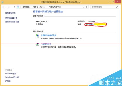 第一步、打开网络和共享中心如下图点击红圈