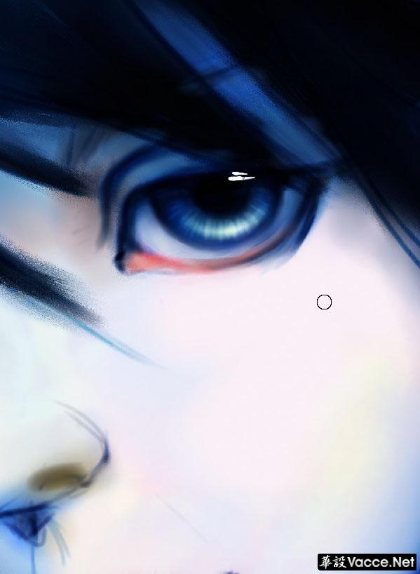 8.刻画眼睛细节, 调整笔头,头发已经用刮刀刮过,呵呵不会显得那么软了/这个时候也是住细腻活的时候, 当然不要画过了毕竟其他地方还没多动, 有个6分就够了.仔细加耐心,注意光泽感.图片如下: