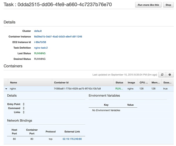 为了说明上述问题,如下面截图所示,我们可以看到定义了一个特定的任务,此任务拥有一个容器,容器托管nginx web服务。