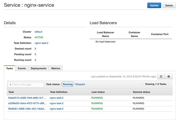 除了任务之外,服务是ECS概念中排名第二重要的。一个服务是给定一个任务所请求运行的特定的实例数量。举例来说,如果我们有一个如上述所定义的运行nginx web服务容器的任务的话,我们则要定义一个服务,来请求3个或更多的实例组成集群,从而完成web服务的任务。