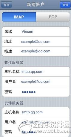 小技巧:点击存储后,iPhone会自动将相关设置补充完整,如果您想手动进行配置(例如换用IMAP协议,或者修改服务器地址),可故意输入一个错误的密码,验证密码失败后就进入了手动设置页面。