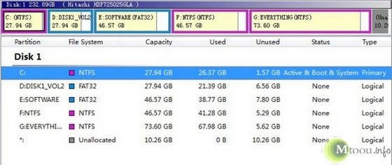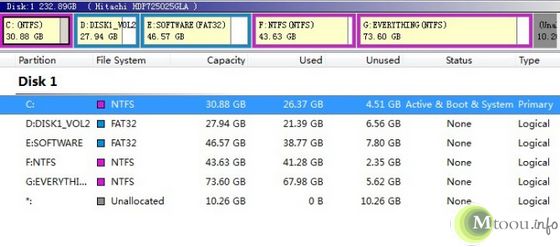 C盘为Primary(主分区),D、E、F、G为Logical(逻辑分区)。一块硬盘只允许有一个主分区,具体一大堆限制可以百度。C盘的外框颜色为紫色,说明是NTFS格式,F、G也是;D、E为蓝色,说明是FAT32格式。两者区别可以去网上查,现在多数为NTFS,比如下载超过4G的电影时硬盘必须为NTFS才能存储,转换dos命令为convert(百度),也可以用这个软件实现。