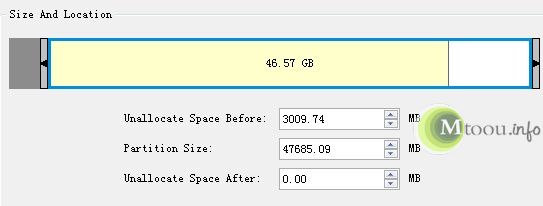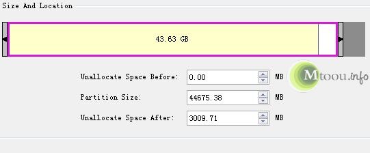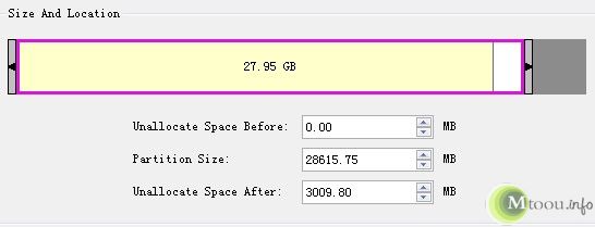 黄色为已用部分,白色为未用的空白部分,鼠标指在方框右边向左拉,下面显示所拖掉的空间,由于鼠标我没法截图,只能用语言解释了。比如拖掉3G=3000M