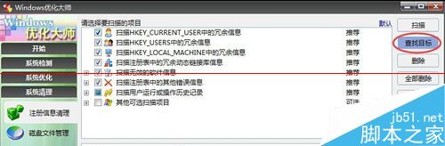 2、先说说找不到或者不知道有没有找全这种情况。这里我利用的是优化大师的注册信息清理里面的查找目标这个功能,其实也可以直接用注册表自带的搜索功能,但是它只能找完一个再进行下一个搜索。这里我们在目标字符串框填“7D2F”,把下面 大小写匹配等三个框框都勾选,然后点击确定进行搜索。