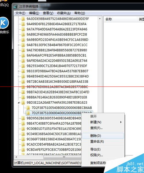 1、我们知道,主要就是要删除7D2F开头的键值,但是有时候找不到这些键值在哪,或者说不知道有没有找全,还有一种是找到了却拒绝访问,无法删除。(注意:注册表的删除有风险,请记得提前备份,防止勿删。)