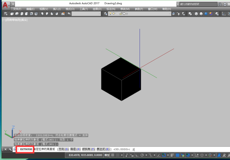 1、首先,在Cad中绘制一个矩形,然后通过三维拉伸命令(EXT),输入拉伸的高度,这里为2,将其拉伸为三维实体。