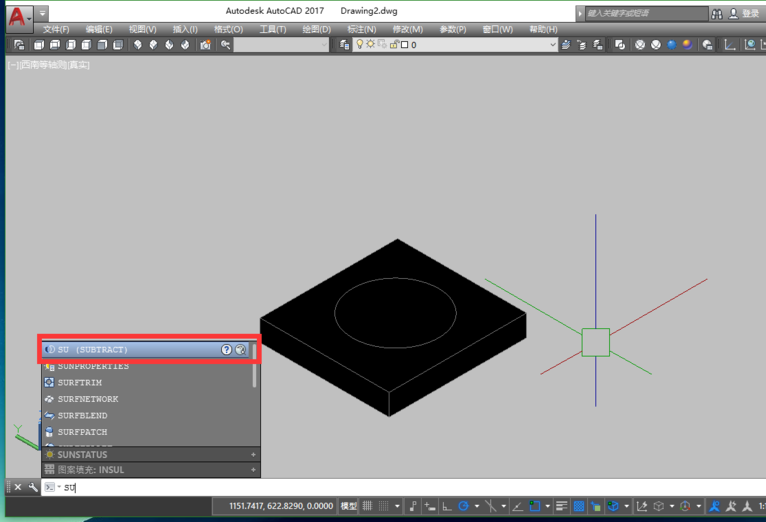 4、长方体移动完成之后,现在就要开始进行差集,“差集”的命令行命令为 SU。