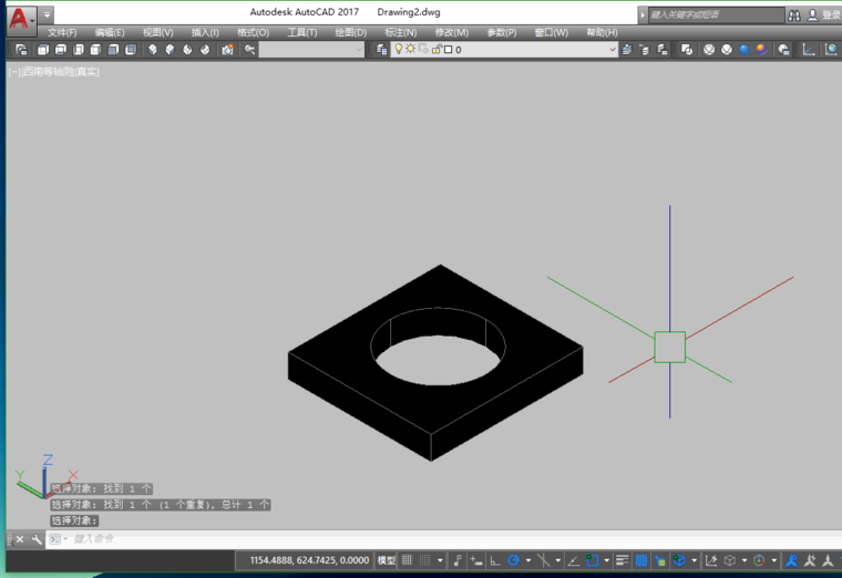 2、我们现在要在这个三维实体上“挖”一个孔,也就是要切除一部分“料”,在Cad三维绘图中,没有直接切除的概念。而是用逻辑运算-“差集”。也就是要切一个什么形状,就要有一个那个形状的三维实体,然后通过差集,将其“切除”。所以,现在需要一个圆柱体。