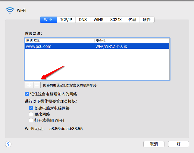 2)点按“—”号按钮,即可删除Mac已经记住的网络。