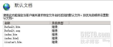 可以看到系统自带有5种默认文档:Default.htm、Default.asp、Index.htm、Index.html、iisstar.htm,其优先级依次从高到低。作为网站首页的Web文件必须使用上述5个名字中的一种,如果是使用的其它名字,则必须将其添加到文档列表中。