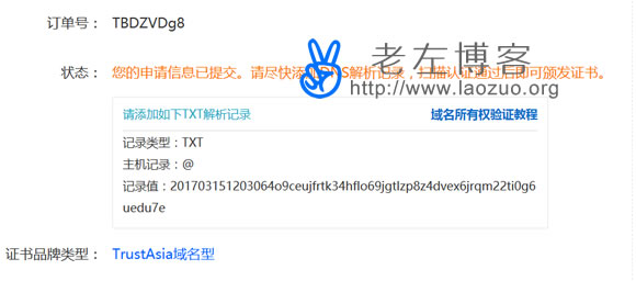 这里有三种类型,我们是需要用免费的,所以选择TrustAsia,域名型DV是免费的。直接提交订单就可以。