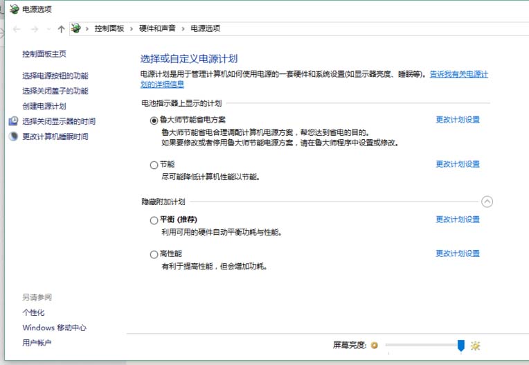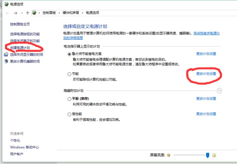 3、可以通过更改电源计划来更改屏幕亮度和性能。也可以自己创建电源计划