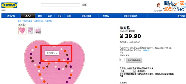 鼠标在图片上悬停时,图片右侧会出现关于商品的细节展示,这是一个在商品详情页中很常见的功能。但使用过程中会发现,就算用户的鼠标无意识的划过图片,细节展示依然会马上呈现,这或多或少会影响到用户体验,而IKEA的网站则很自然地解决了这一问题。