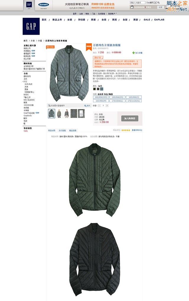 GAP的商品详情页几乎没有任何多余的部分,页面中的内容都围绕着一个商品而展开,为用户营造出良好舒适的购物环境。
