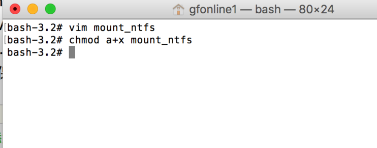 修改挂载文件权限:chmod a+x mount_ntfs,退出root:exit