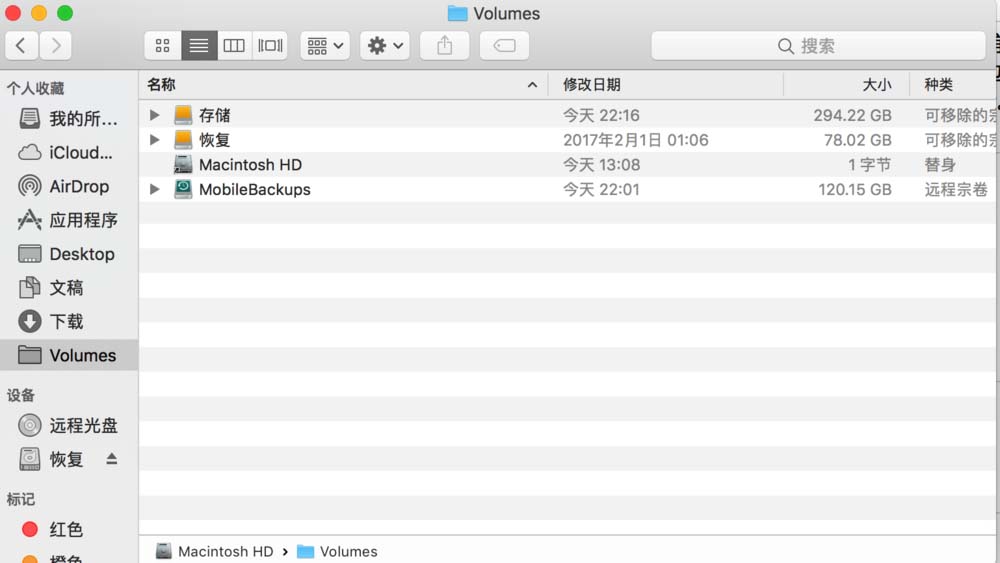 由于新挂载的ntfs盘不能显示在Finder中,所以打开Finder前往文件夹 /Volumes,然后在用 cmmand+control+T 将 /Volumes 保存到边栏,在插入移动设备后不会在桌面显示,可以在Finder边栏的Volumes中查看。