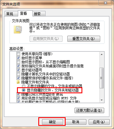 1.使用鼠标依次打开“计算机—工具—文件夹选项—查看—显示隐藏的文件、文件或驱动器”,然后点击“确定”即可;如下图所示: