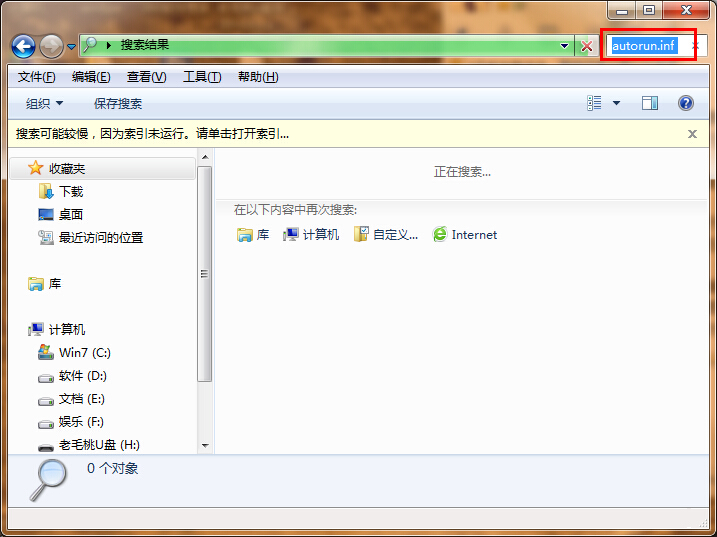 2.接着使用快捷键“win+f”打开搜索窗口,在打开搜索窗口中输入“autorun.inf”,按回车键,将找到的“autorun.inf”文件全部删除即可;如下图所示: