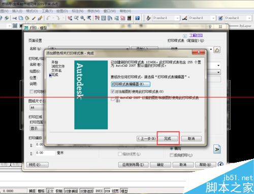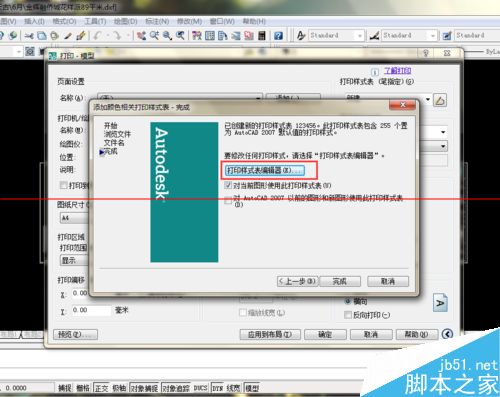6.此时可点击完成,就创立了新的打印样式表,如果需修改线宽,可后面再修改,也可现在就点击“打印样式表编辑器”。
