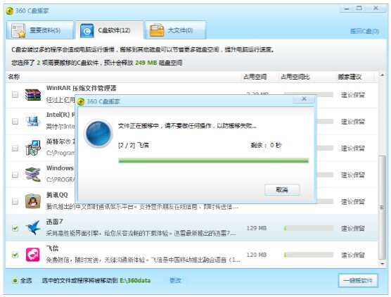 搬家的过程很快,一般的软件只要几秒种就能搞定。搬家完成后,360C盘搬家还会提示释放磁盘空间量。