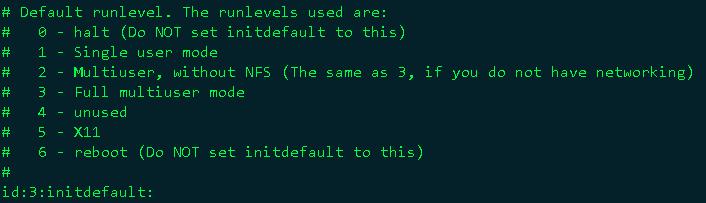 CentOS及RedHat中可通过修改/etc/inittab文件中的id:3:initdefault来更改启动项。如果id是3则启动的是文本命令终端模式,将3改为5则会默认启动图形界面(即Xwindow)模式。inittab是不可执行的文本文件,会在Linux完成内核引导后,被init初始化进程调用,是一个配置文件。文件中id的格式为:id:run-level:action:process,各项之间用冒号隔开,其中某些部分可为空,我的Centos6系统中的inittab文件就只有其中的前面3项,process为空。id标识符唯一,在配置文件中不能重复。run-level指定系统运行级别,通过vi /etc/inittab查看该文件时可看到下图所示的解释: