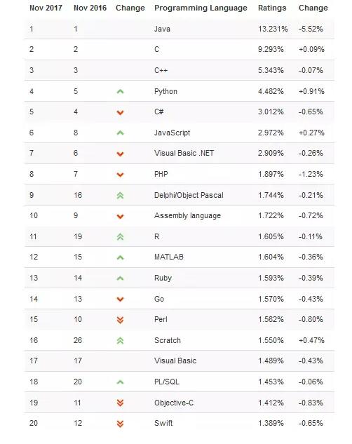 还值得注意的是排行第一的 Java,持续下滑,下滑 5.52%,在前 20 名中也是排行第一,难道 Java 也要 out 了?