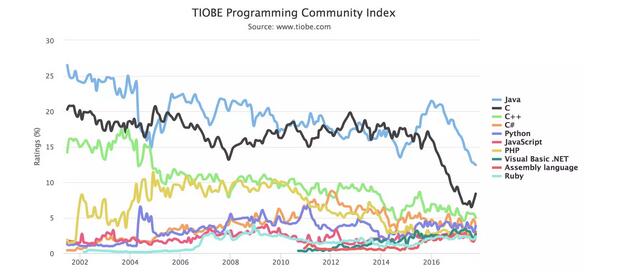 Top 10 编程语言 TIOBE 指数走势(2002-2016)