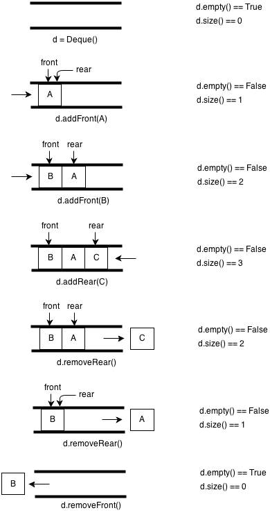 在Python中,有两种方式可以实现上述的双端队列ADT:使用内建类型list、使用标准库collections.deque(其实collections.deque就是Python中双端队列的标准实现)。